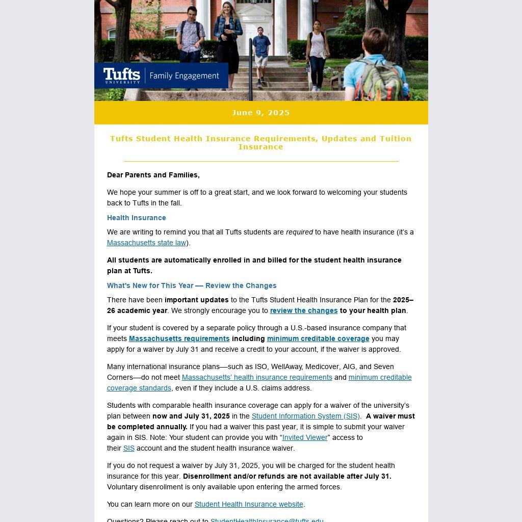 Deadline to waive Tufts health insurance is July 31, 2025