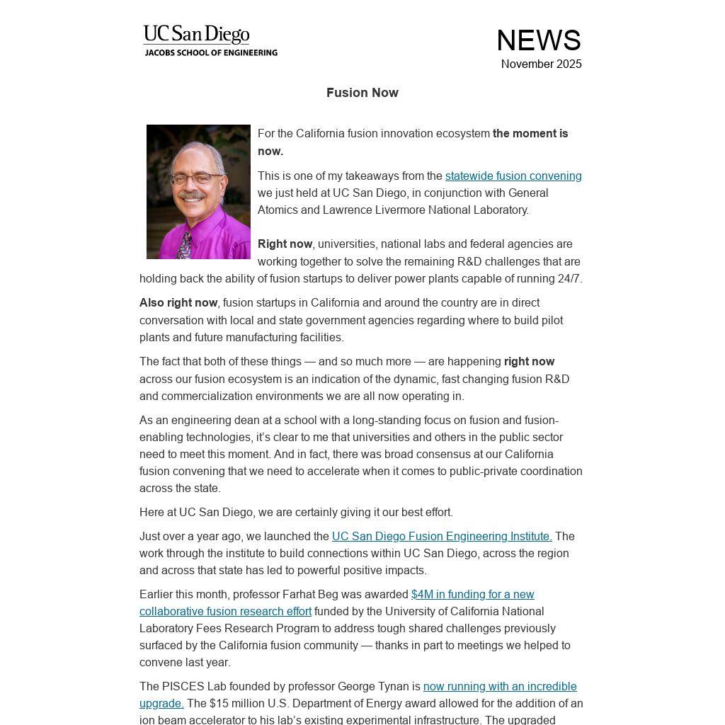 UC San Diego Fusion Engineering Institute. The work through the institute to build connections within UC San Diego, across the region and across that state has led to powerful positive impacts.