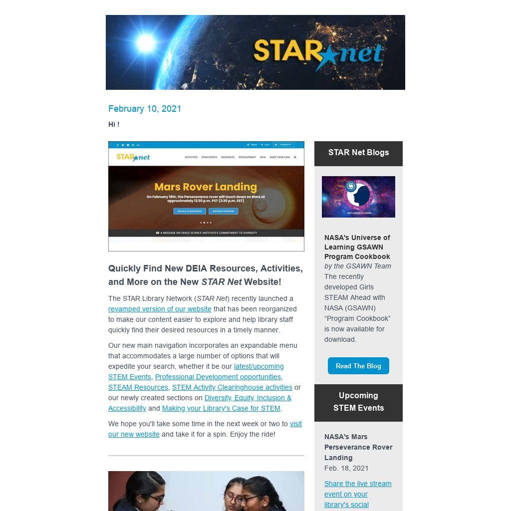 STAR Net is built upon a strong network of collaborators and partners, led by the Space Science Institute’s (SSI) National Center for Interactive Learning (NCIL). Partners include the American Library Association’s Public Programs Office, Collaborative Summer Library Program, Chief Officers of State Library Agencies, Lunar and Planetary Institute, Education Development Center, Twin Cities PBS (TPT), Institute for Learning Innovation (ILI), University of Colorado, University of Virginia, Urban Libraries Council, American Society of Civil Engineers, and Cornerstones of Science. Funding is provided by the National Science Foundation, NASA Science Mission Directorate, and the Institute of Museum and Library Services.