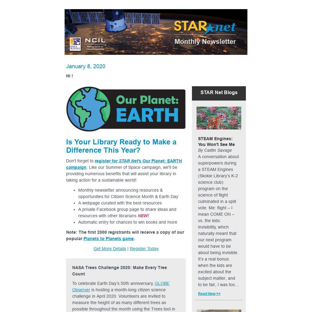The STAR Library Network (STAR Net) is a hands-on learning network for libraries and their communities across the country. STAR Net focuses on helping library professionals build their STEM skills by providing “science-technology activities and resources” (STAR) and training to use those resources. Plus, engage public audiences nationwide in informal and lifelong learning with the excitement of exploration and discovery through STAR Net's NASA@ My Library program!
