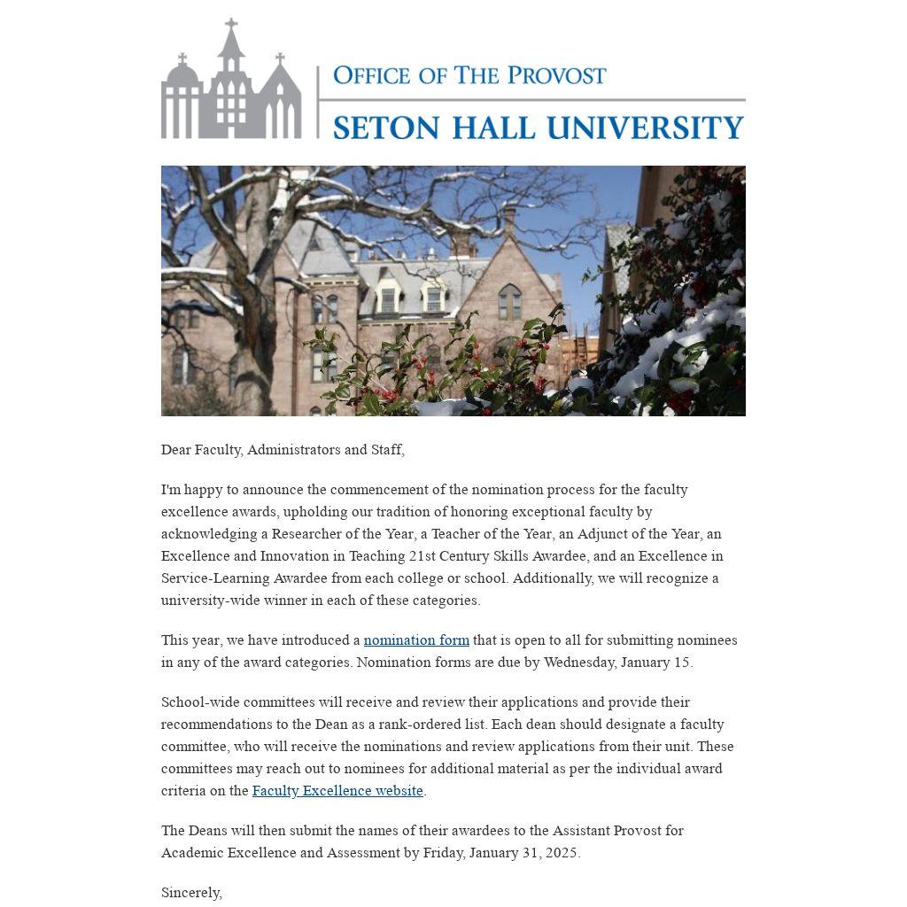 I'm happy to announce the commencement of the nomination process for the faculty excellence awards, upholding our tradition of honoring exceptional faculty by acknowledging a Researcher of the Year, a Teacher of the Year, an Adjunct of the Year, an Excellence and Innovation in Teaching 21st Century Skills Awardee, and an Excellence in Service-Learning Awardee from each college or school. Additionally, we will recognize a university-wide winner in each of these categories.