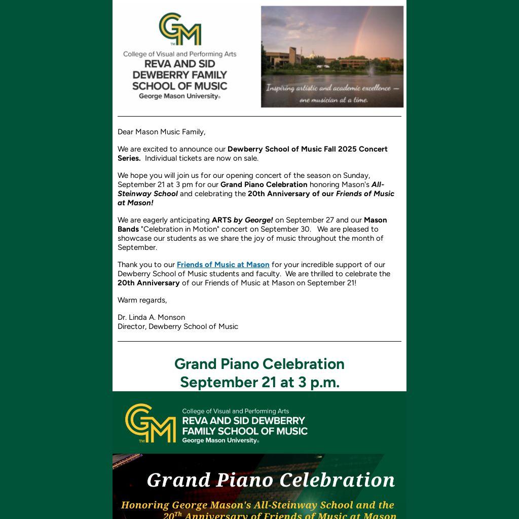 We hope you will join us for our opening concert of the season on Sunday, September 21 at 3 pm for our Grand Piano Celebration honoring Mason's All-Steinway School and celebrating the 20th Anniversary of our Friends of Music at Mason!