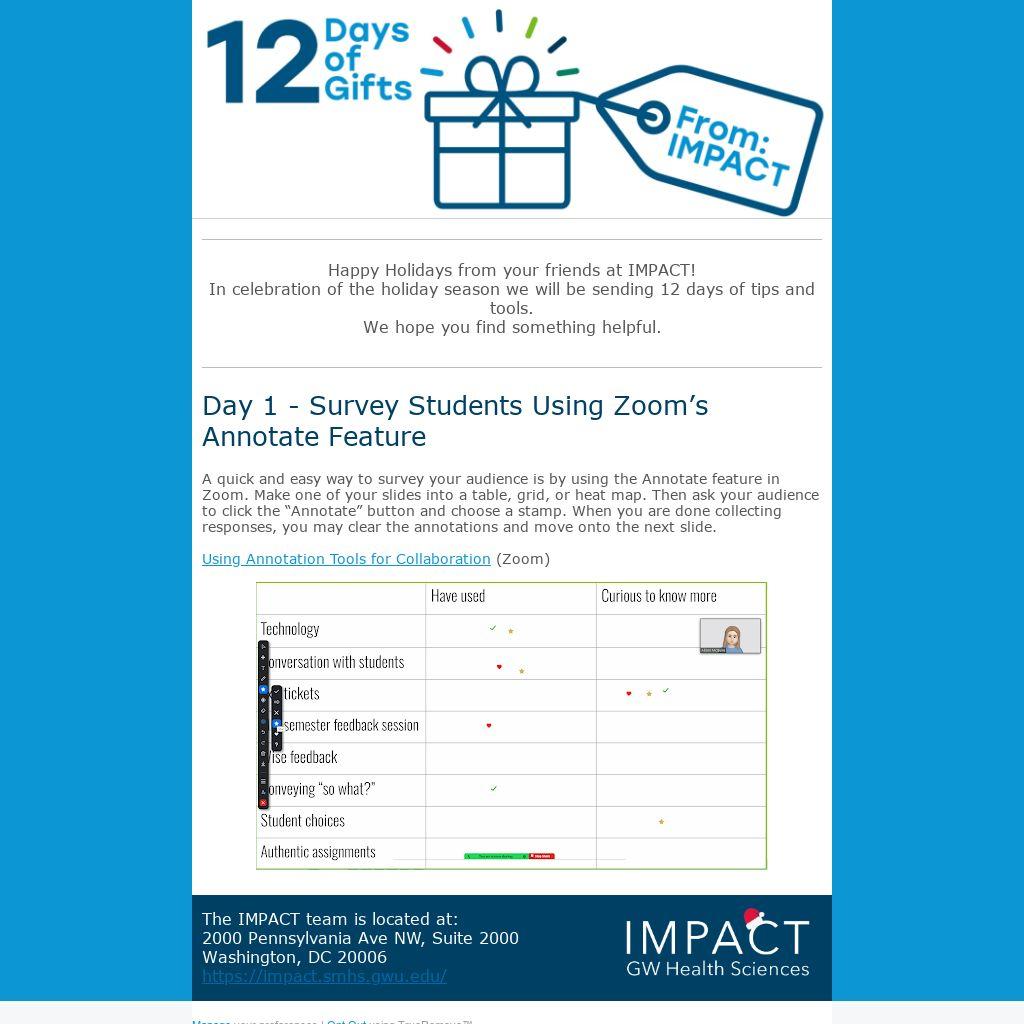 A quick and easy way to survey your audience is by using the Annotate feature in Zoom. Make one of your slides into a table, grid, or heat map. Then ask your audience to click the “Annotate” button and choose a stamp. When you are done collecting responses, you may clear the annotations and move onto the next slide.