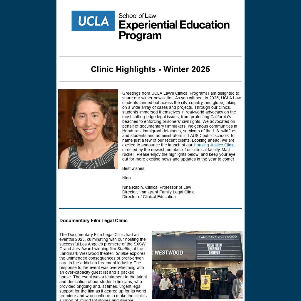 Greetings from UCLA Law’s Clinical Program! I am delighted to share our winter newsletter. As you will see, in 2025, UCLA Law students fanned out across the city, country, and globe, taking on a wide array of cases and projects. Through our clinics, students immersed themselves in real-world advocacy on the most cutting-edge legal issues, from protecting California’s beaches to enforcing prisoners’ civil rights. We advocated on behalf of documentary filmmakers, indigenous communities in Honduras, immigrant detainees, survivors of the L.A. wildfires, and students and administrators in LAUSD public schools, to name just a few of our recent clients. Looking ahead, we are excited to announce the launch of our Housing Justice Clinic, directed by the newest member of our clinical faculty, Matt Nickell. Please enjoy the highlights below, and keep your eye out for more exciting news and updates in the year to come!
