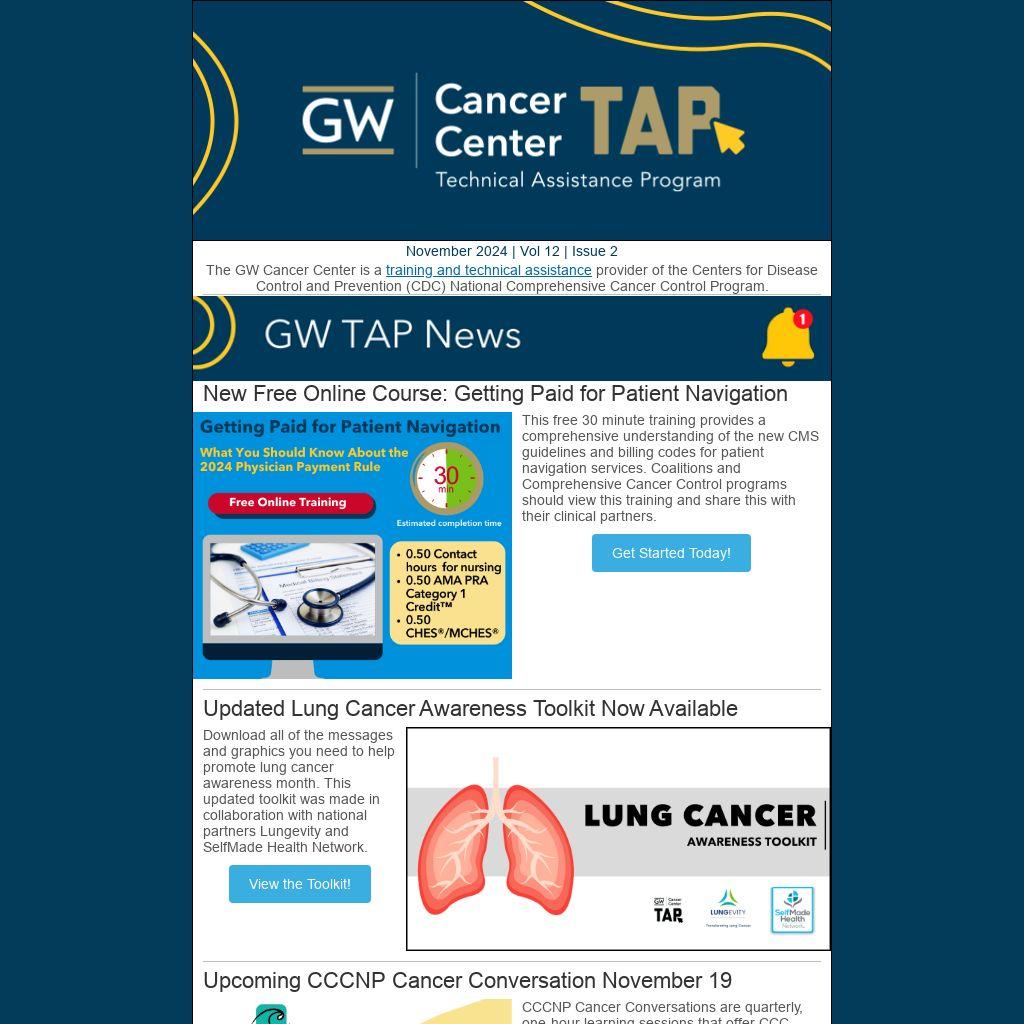 The GW Cancer Center is a training and technical assistance provider of the Centers for Disease Control and Prevention (CDC) National Comprehensive Cancer Control Program.