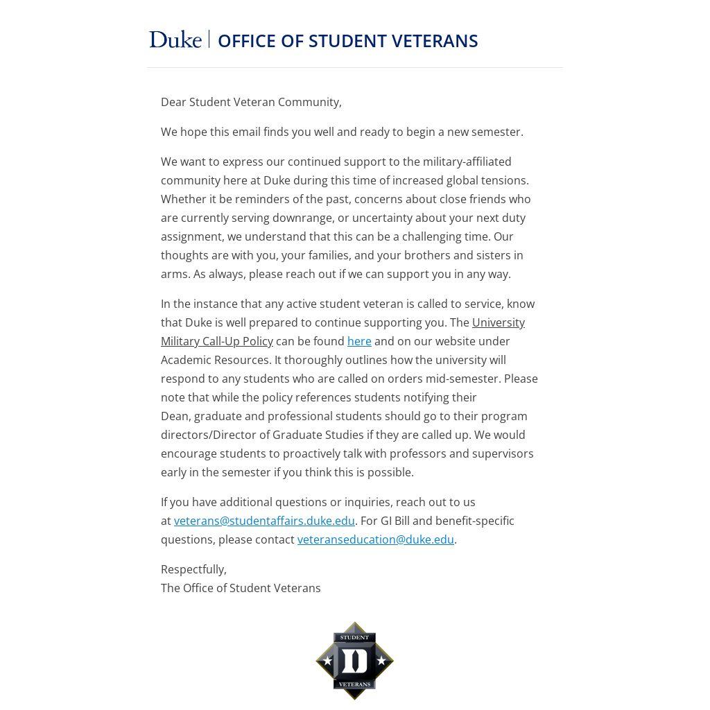 In the instance that any active student veteran is called to service, know that Duke is well prepared to continue supporting you. The