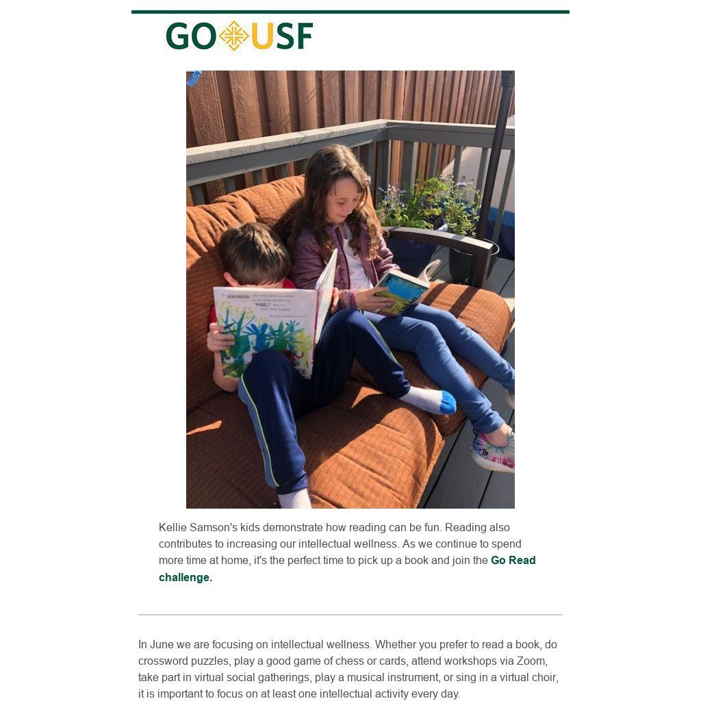 Kellie Samson's kids demonstrate how reading can be fun. Reading also contributes to increasing our intellectual wellness. As we continue to spend more time at home, it's the perfect time to pick up a book and join the Go Read challenge.