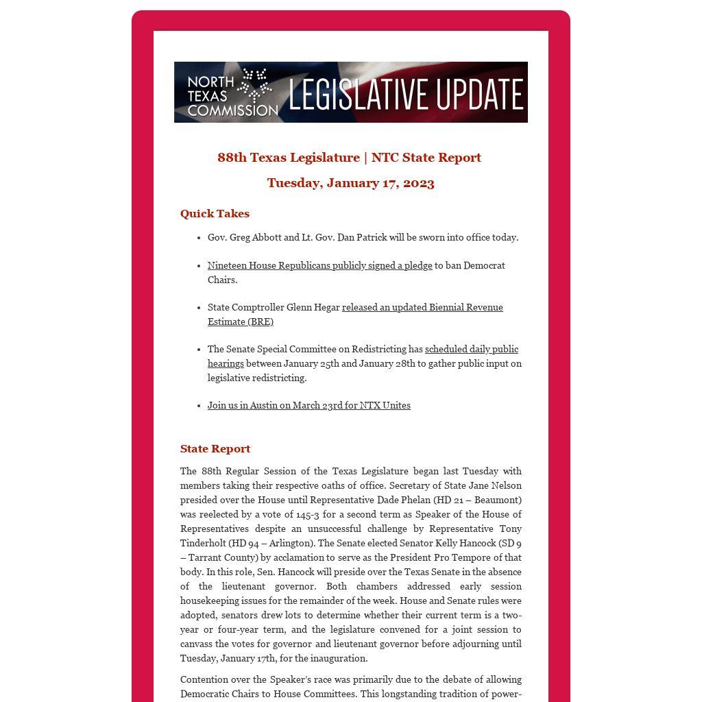 Contention over the Speaker’s race was primarily due to the debate of allowing Democratic Chairs to House Committees. This longstanding tradition of power-sharing with the minority party, supported by Phelan, has become a chief concern of a small faction of Republican lawmakers. Nineteen House Republicans publicly signed a pledge to ban Democrat Chairs. However, only 3 House Members voted against Phelan last Tuesday. The dissenting votes were placed by North Texas Delegation members: Bryan Slaton (HD 2 – Royse City), Nate Schatzline (HD 93 – Fort Worth), and Tony Tinderholt (HD 94 – Arlington).
