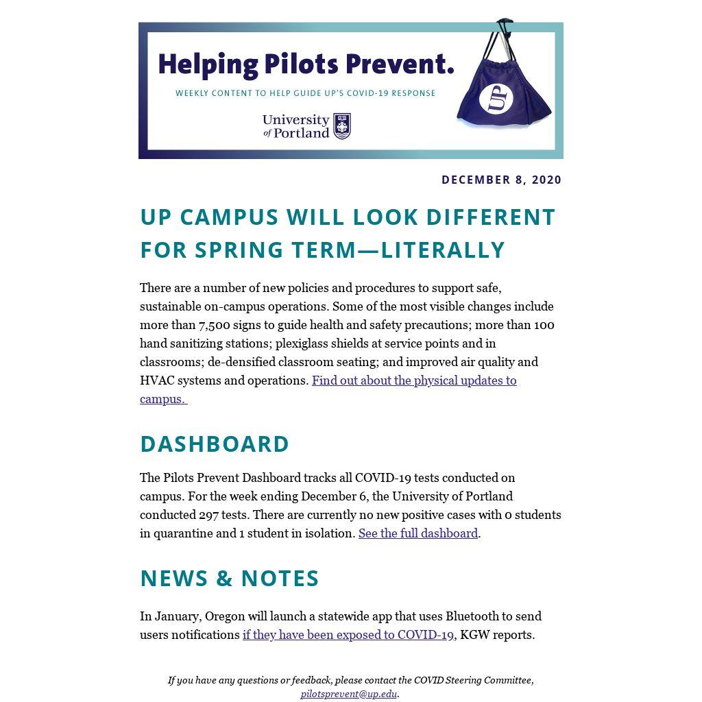 If you have any questions or feedback, please contact the COVID Steering Committee, pilotsprevent@up.edu.