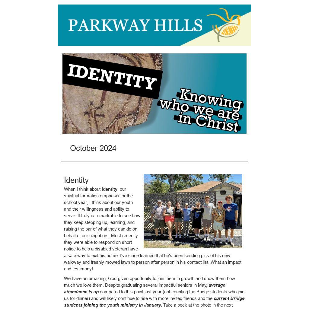 When I think about Identity, our spiritual formation emphasis for the school year, I think about our youth and their willingness and ability to serve. It truly is remarkable to see how they keep stepping up, learning, and raising the bar of what they can do on behalf of our neighbors. Most recently they were able to respond on short notice to help a disabled veteran have a safe way to exit his home. I've since learned that he's been sending pics of his new walkway and freshly mowed lawn to person after person in his contact list. What an impact and testimony!