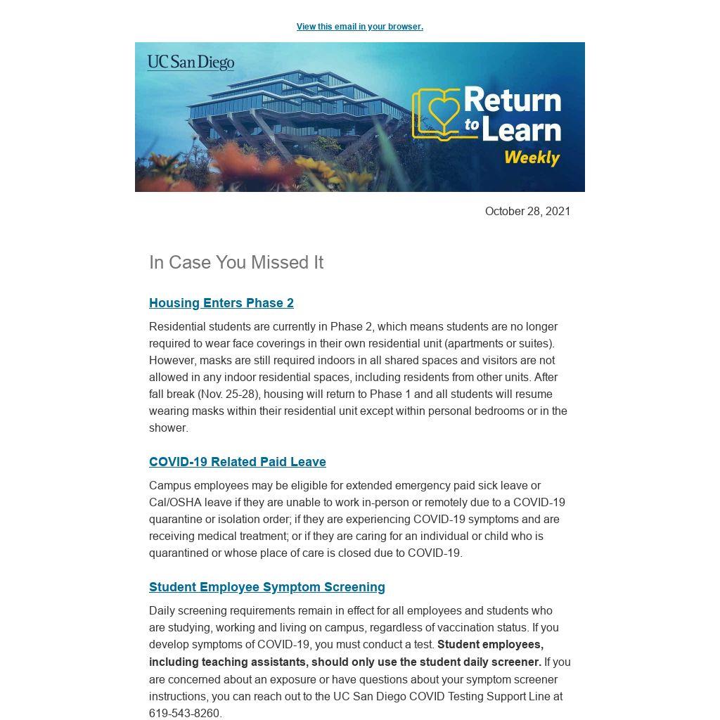 Learn more on the Return to Learn Exposure and Contact Tracing page.