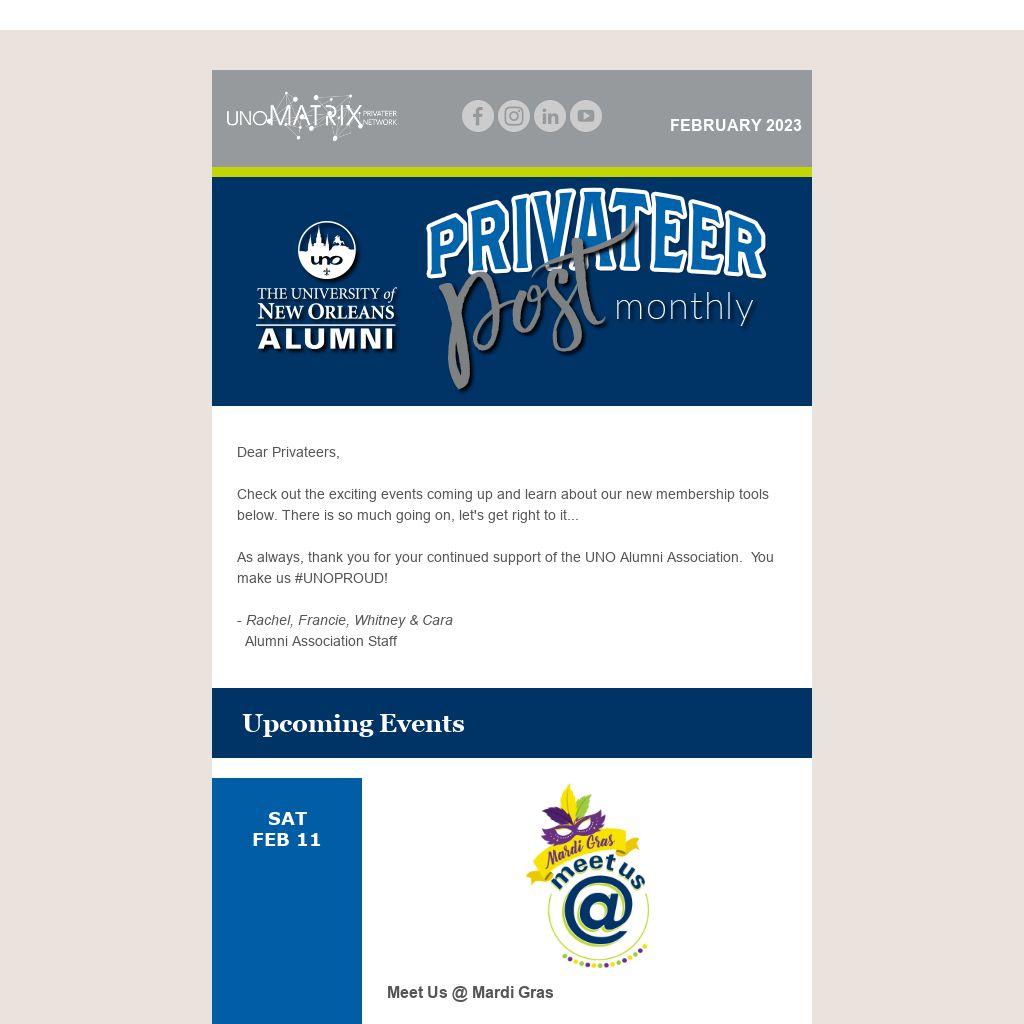 As always, thank you for your continued support of the UNO Alumni Association. You make us #UNOPROUD! - Rachel, Francie, Whitney & Cara Alumni Association Staff