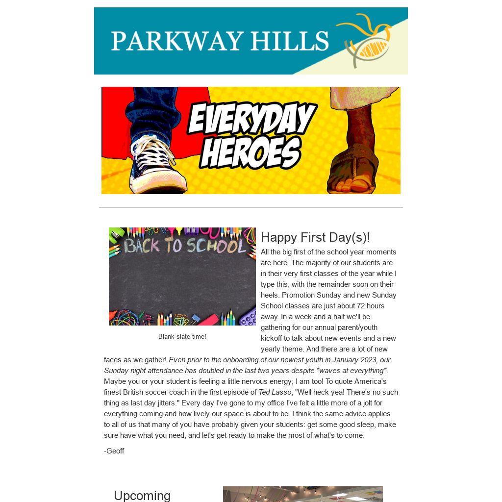 August 14, 5:30-7:30: Back to School Kickoff Meeting. Parents and youth are invited for our annual fellowship and sharing time as we start the new year together. Light dinner will be served.