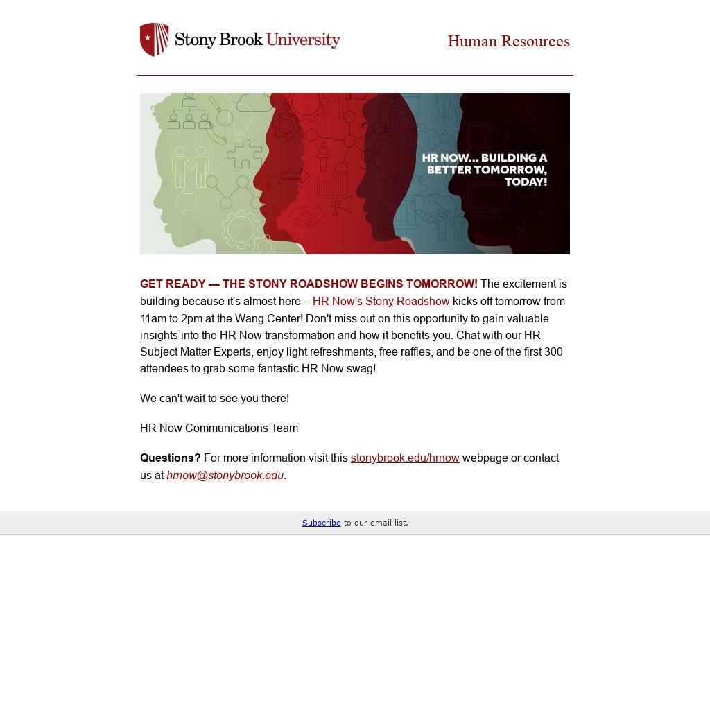 GET READY — THE STONY ROADSHOW BEGINS TOMORROW! The excitement is building because it's almost here – HR Now's Stony Roadshow kicks off tomorrow from 11am to 2pm at the Wang Center! Don't miss out on this opportunity to gain valuable insights into the HR Now transformation and how it benefits you. Chat with our HR Subject Matter Experts, enjoy light refreshments, free raffles, and be one of the first 300 attendees to grab some fantastic HR Now swag!