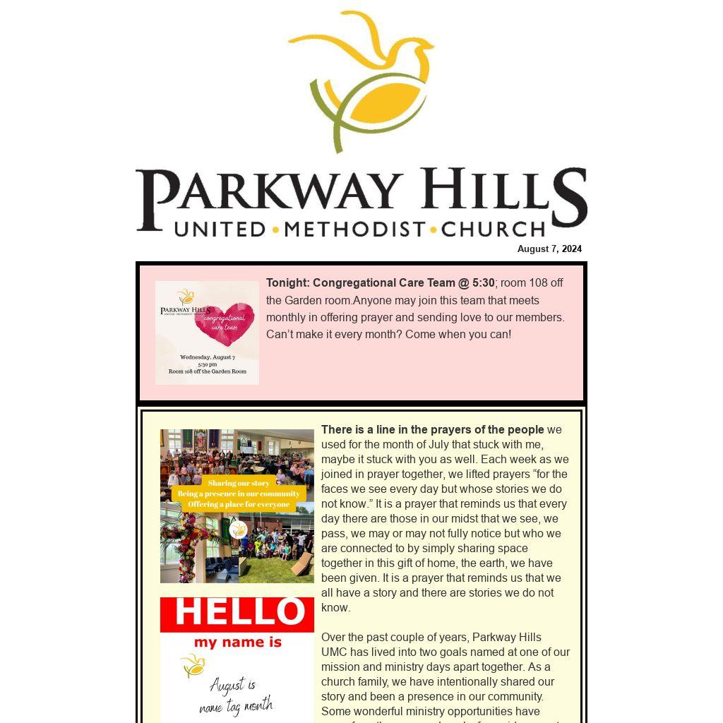 Over the past couple of years, Parkway Hills UMC has lived into two goals named at one of our mission and ministry days apart together. As a church family, we have intentionally shared our story and been a presence in our community. Some wonderful ministry opportunities have come from these named goals, from videos sent out via social media to participating in community events such as the Scarecrow Festival. This year we will add to this goal list by continuing in prayer for those faces we see every day but whose stories we do not know by invitationally offering a place for everyone. It all begins this month with our August “Name Tag Month.” This is your chance to get to know those who share in worship with you each week but whose stories you may not know! We’ve got lots of other ideas for the year from newly designed visitor information, a “Guess Who’s Coming to Dinner” party, a monthly meet and greet, some “invite a friend” challenges through the year, and much more. So stay tuned!