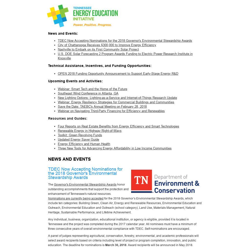 | TDEC Now Accepting Nominations for the 2018 Governor's Environmental Stewardship Awards