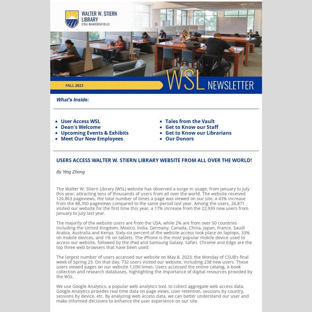 The Walter W. Stiern Library (WSL) website has observed a surge in usage, from January to July this year, attracting tens of thousands of users from all over the world. The website received 126,863 pageviews, the total number of times a page was viewed on our site, a 43% increase from the 88,350 pageviews compared to the same period last year. Among the users, 26,871 visited our website for the first time this year, a 17% increase from the 22,939 new users from January to July last year.