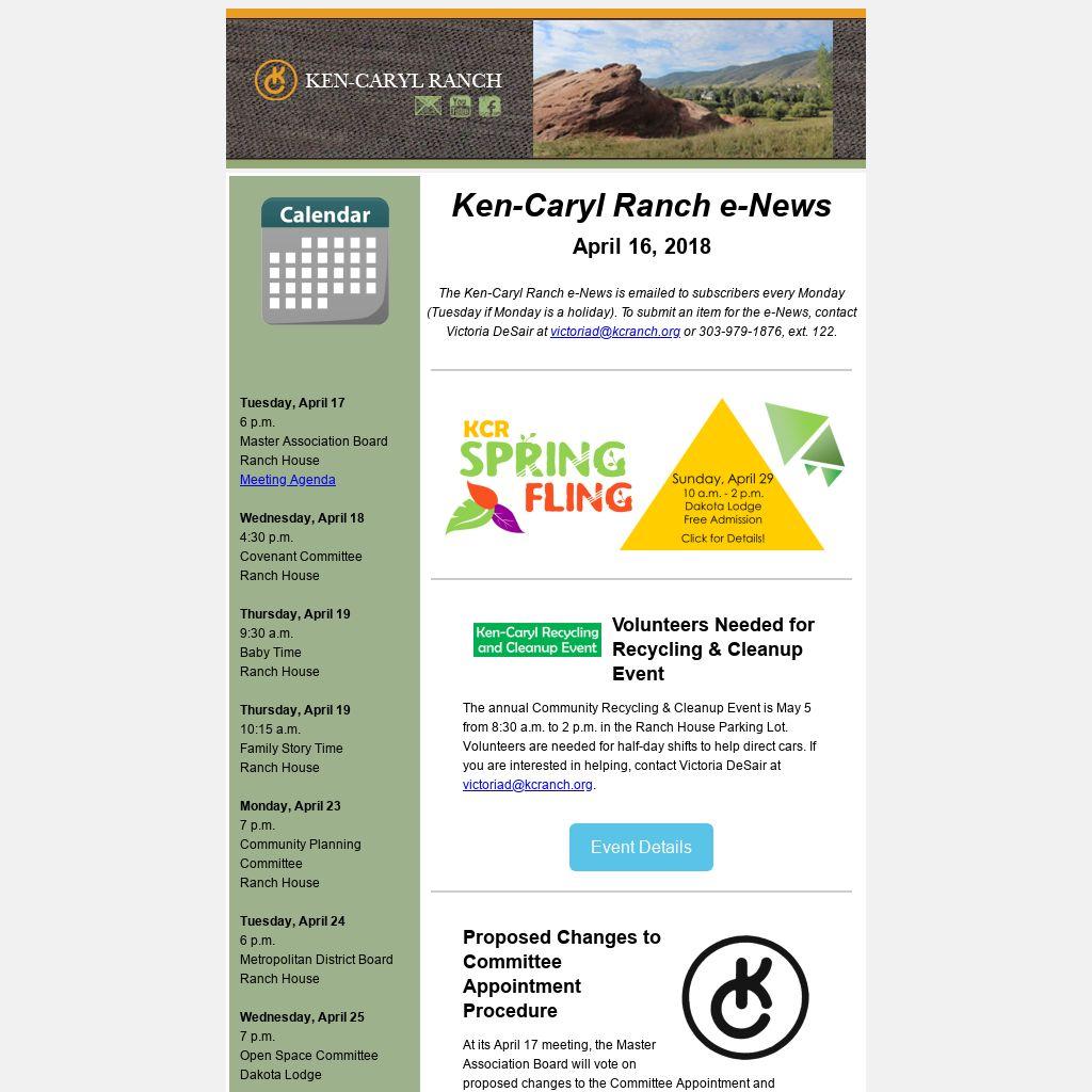 Volunteers Needed for Recycling & Cleanup EventThe annual Community Recycling & Cleanup Event is May 5 from 8:30 a.m. to 2 p.m. in the Ranch House Parking Lot. Volunteers are needed for half-day shifts to help direct cars. If you are interested in helping, contact Victoria DeSair at victoriad@kcranch.org.