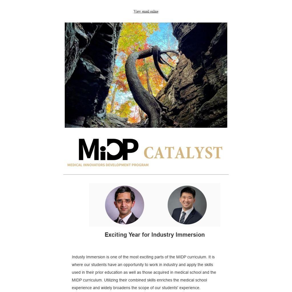 Industy Immersion is one of the most exciting parts of the MIDP curriculum. It is where our students have an opportunity to work in industry and apply the skills used in their prior education as well as those acquired in medical school and the MIDP curriculum. Utilizing their combined skills enriches the medical school experience and widely broadens the scope of our students' experience.