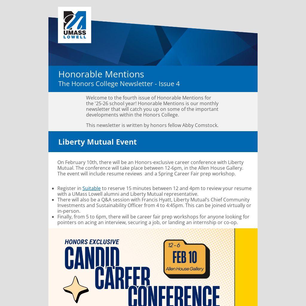 On February 10th, there will be an Honors-exclusive career conference with Liberty Mutual. The conference will take place between 12-6pm, in the Allen House Gallery. The event will include resume reviews and a Spring Career Fair prep workshop.