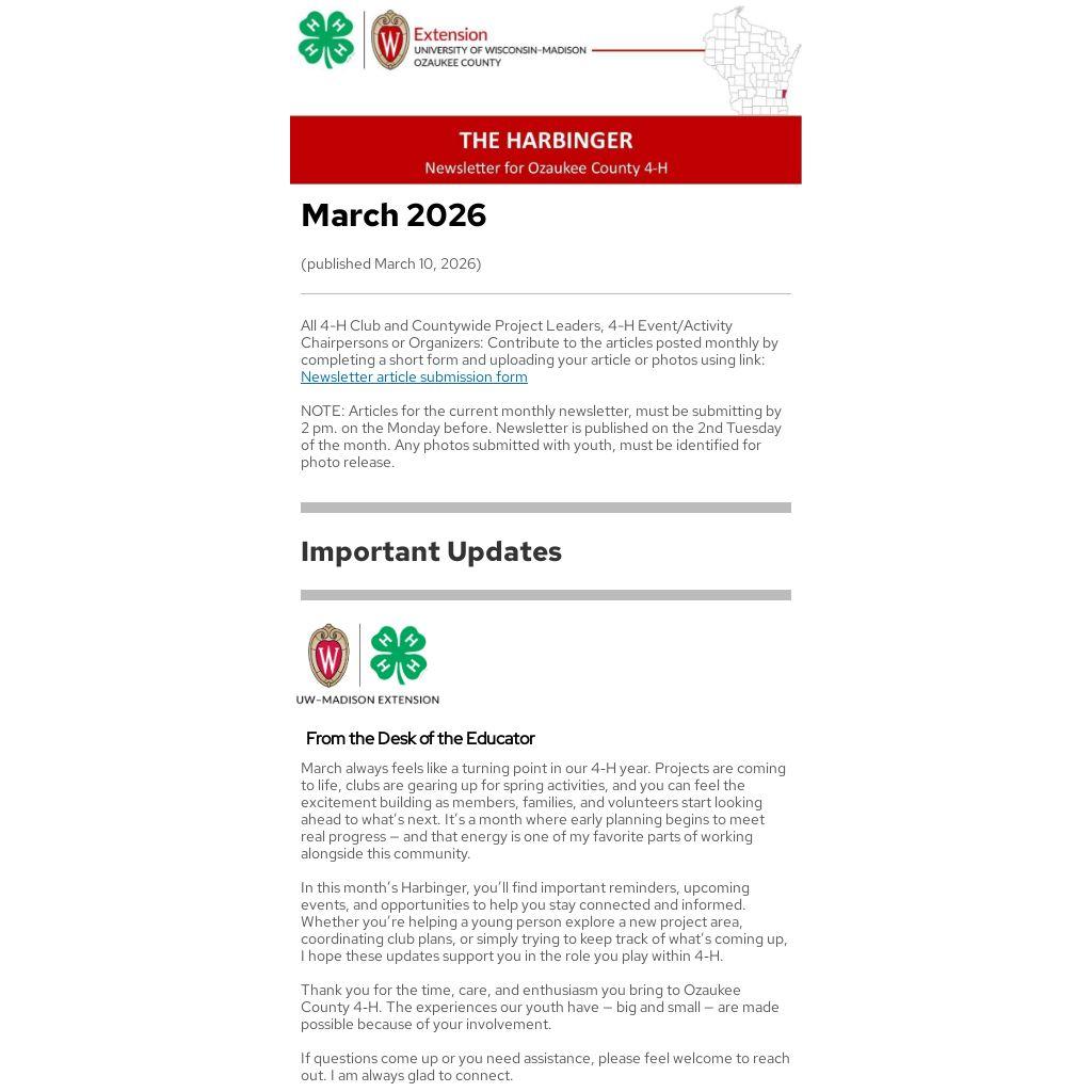 In this month’s Harbinger, you’ll find important reminders, upcoming events, and opportunities to help you stay connected and informed. Whether you’re helping a young person explore a new project area, coordinating club plans, or simply trying to keep track of what’s coming up, I hope these updates support you in the role you play within 4‑H.