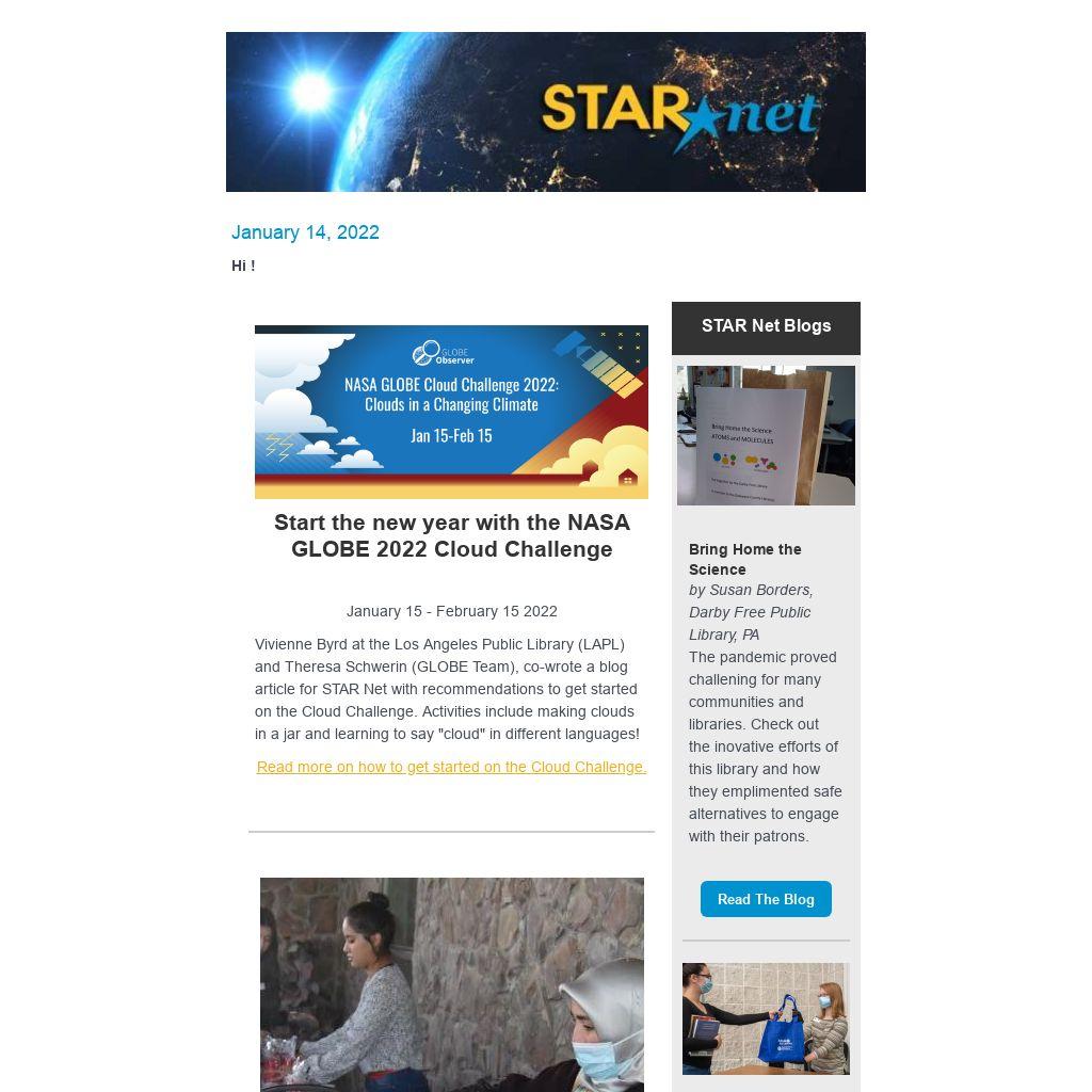 Vivienne Byrd at the Los Angeles Public Library (LAPL) and Theresa Schwerin (GLOBE Team), co-wrote a blog article for STAR Net with recommendations to get started on the Cloud Challenge. Activities include making clouds in a jar and learning to say "cloud" in different languages!