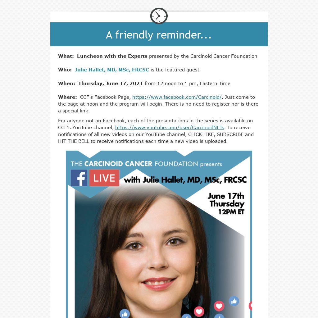 Julie Hallet, MD, MSc, FRCSC, surgical oncologist at Sunnybrook Health Sciences Centre in Toronto, Canada, will be the featured guest for Luncheon with the Experts on Thursday, June 17 from 12 noon to 1 pm, Eastern Time. Dr. Hallet is an Associate Scientist at the Odette Cancer Research Program, Sunnybrook Research Institute, and an Assistant Professor in the Department of Surgery at the University of Toronto. She is one of four core oncologists at the Susan Leslie Multidisciplinary Neuroendocrine Tumors Clinic. Her clinical expertise includes neuroendocrine tumors; hepatobiliary, pancreatic and upper gastrointestinal malignancies; and minimally invasive and image-guided therapies.