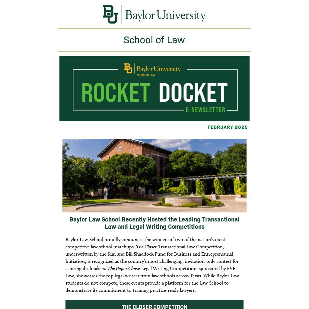 Baylor Law School proudly announces the winners of two of the nation’s most competitive law school matchups. The Closer Transactional Law Competition, underwritten by the Kim and Bill Shaddock Fund for Business and Entrepreneurial Initiatives, is recognized as the country’s most challenging, invitation-only contest for aspiring dealmakers. The Paper Chase Legal Writing Competition, sponsored by FVF Law, showcases the top legal writers from law schools across Texas. While Baylor Law students do not compete, these events provide a platform for the Law School to demonstrate its commitment to training practice-ready lawyers.