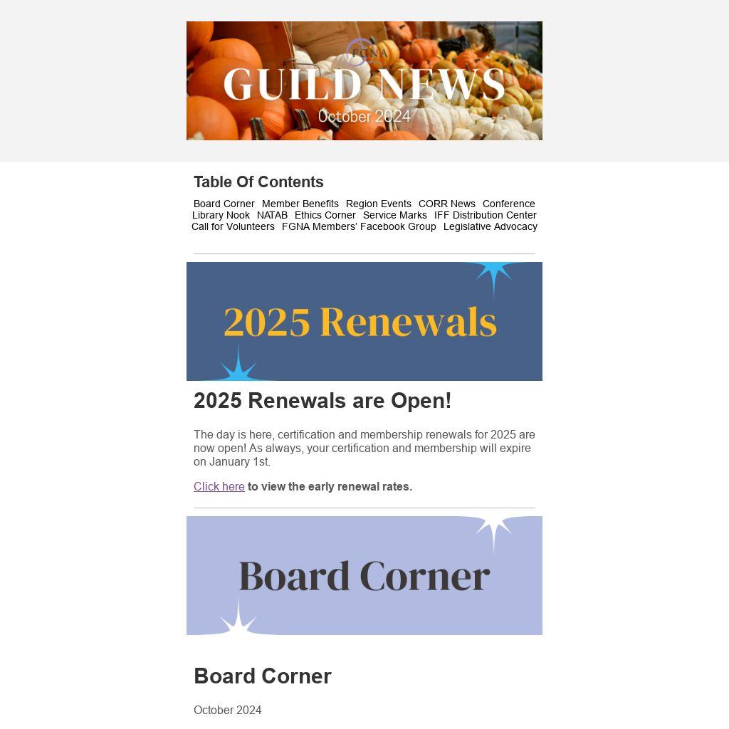 Nominations for candidates to run for the Board of Directors and Nominating Committee are still open until October 6th. Volunteer Here There are numerous other FGNA Committees that would love to have your help. If you are interested in volunteering for any project or committee, please email fgnavolunteers@gmail.com.