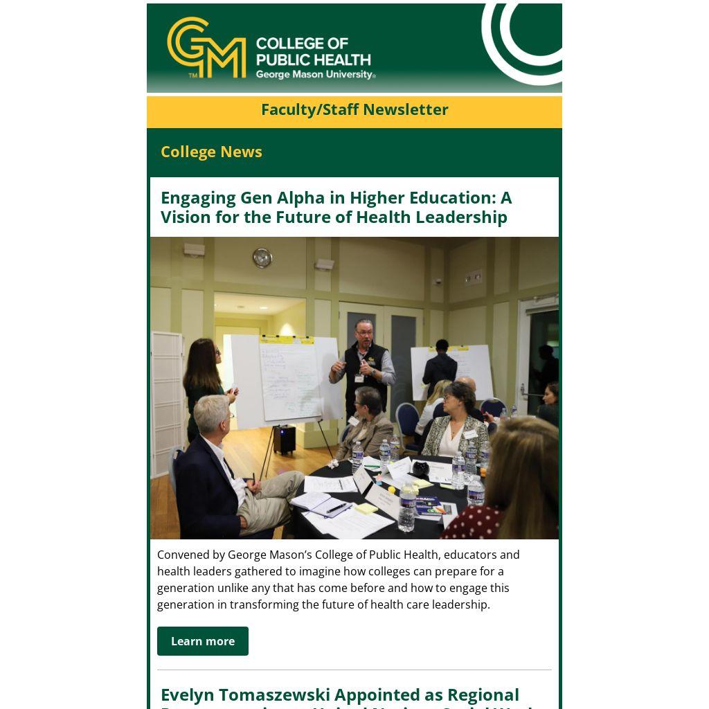Convened by George Mason’s College of Public Health, educators and health leaders gathered to imagine how colleges can prepare for a generation unlike any that has come before and how to engage this generation in transforming the future of health care leadership.