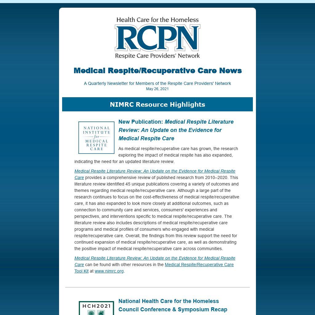 - Is your medical respite/recuperative care program profile in the NIMRC directory up to date? Complete this program profile form to update your information, and view the directory here.