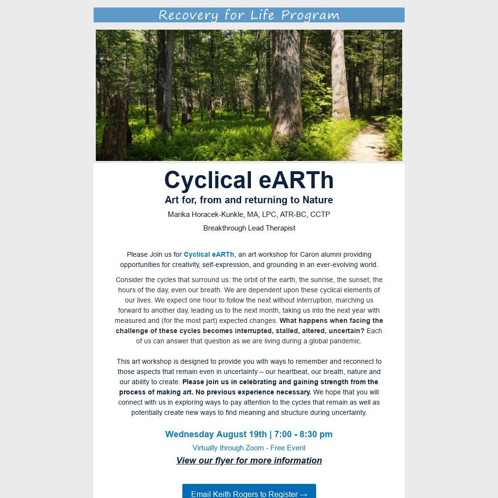 Please Join us for Cyclical eARTh, an art workshop for Caron alumni providing opportunities for creativity, self-expression, and grounding in an ever-evolving world.