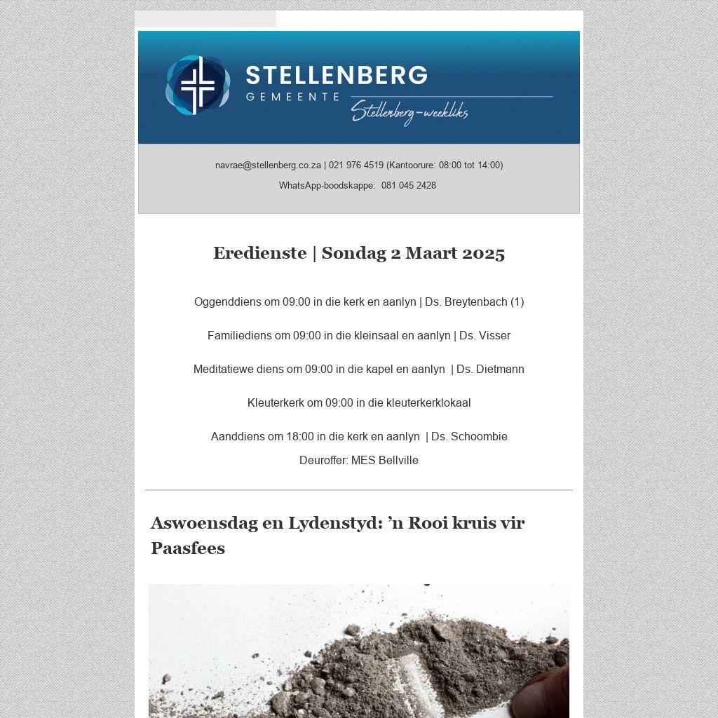 Plaas gerus ’n advertensie in die Stellenberg-weekliks. Die nuusblad word tans weekliks elektronies aan 2 500 persone gestuur en is ook op die gemeente se webwerf beskikbaar. Advertensies sal slegs aanlyn beskikbaar wees en word nie in gedrukte formaat uitgegee nie. Lees meer . . .
