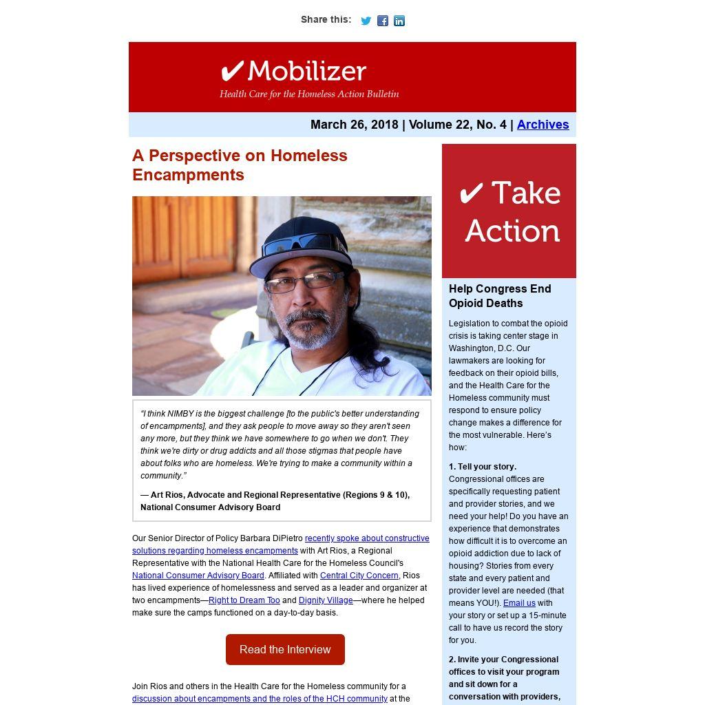 | Help Congress End Opioid Deaths Legislation to combat the opioid crisis is taking center stage in Washington, D.C. Our lawmakers are looking for feedback on their opioid bills, and the Health Care for the Homeless community must respond to ensure policy change makes a difference for the most vulnerable. Here’s how: