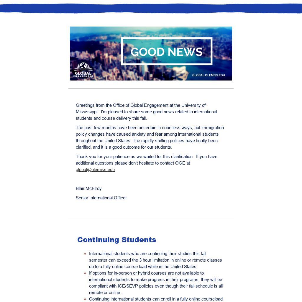 Greetings from the Office of Global Engagement at the University of Mississippi. I'm pleased to share some good news related to international students and course delivery this fall.