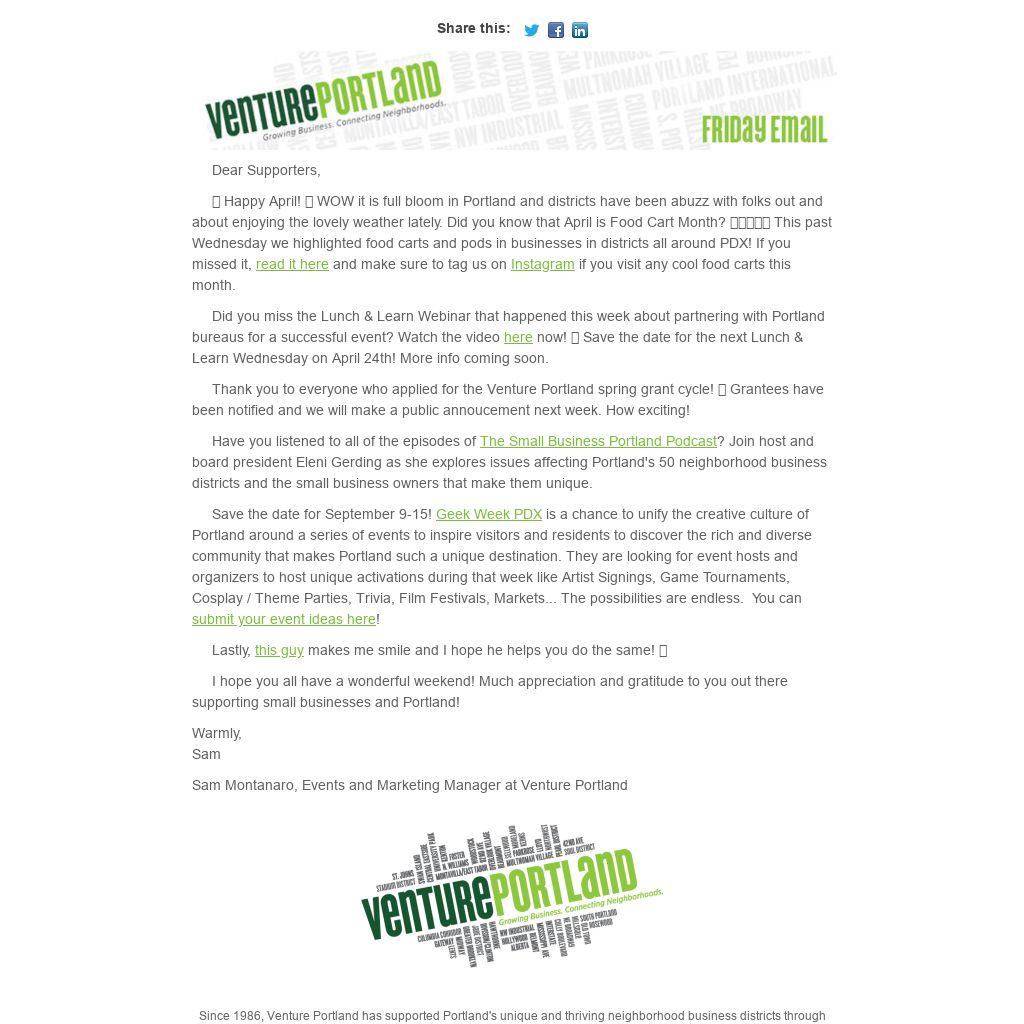 Thank you to everyone who applied for the Venture Portland spring grant cycle! π° Grantees have been notified and we will make a public annoucement next week. How exciting!