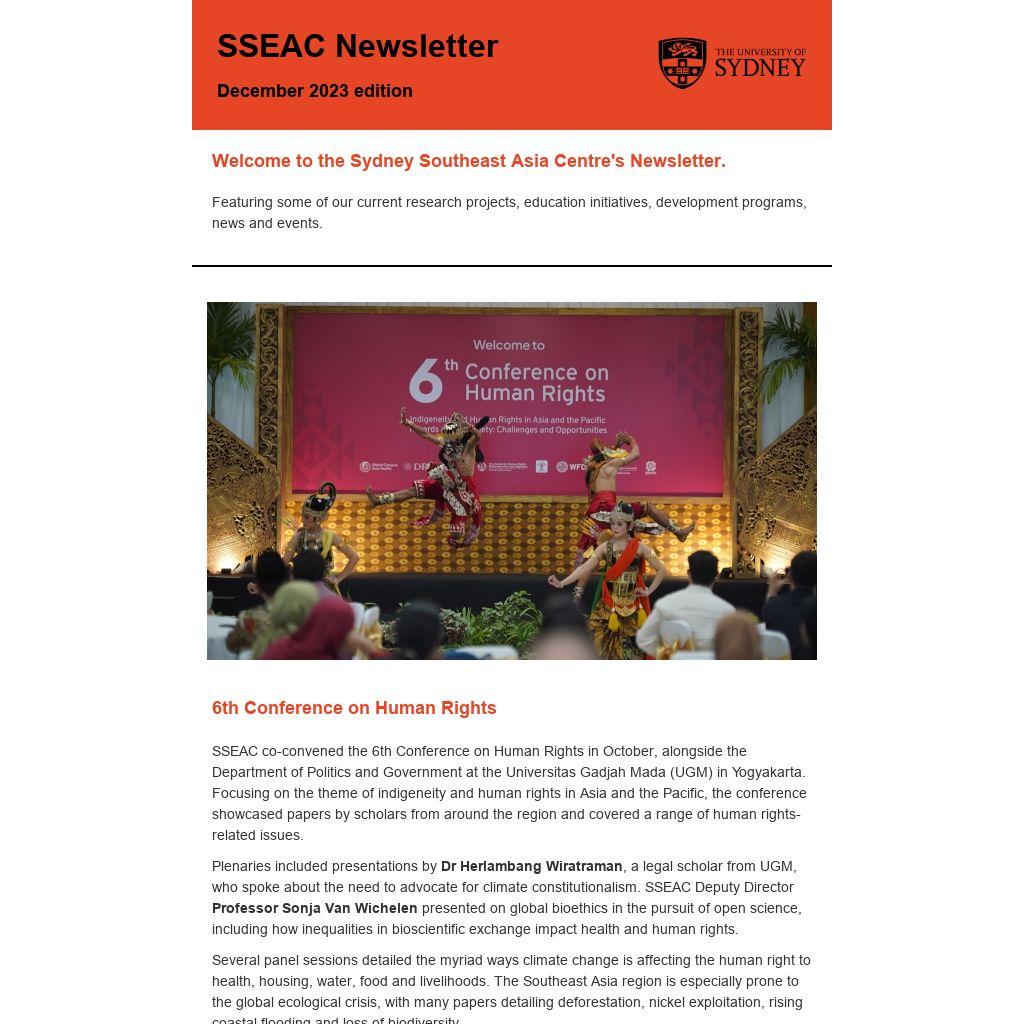 We also farewell SSEAC’s excellent Deputy Director, Professor Sonja Van Wichelen. Sonja has been with the Centre since the start of 2023, and in that time brought a lot of expertise and energy to the role. She successfully led the 6th Human Rights Conference, hosted delegations from the region and coordinated our flagship events. Sonja will be very much missed at SSEAC, but we are delighted that she will continue in her role on SSEAC’s Executive Committee. We wish Sonja all the very best on her return to the School of Social and Political Sciences at the beginning of 2024.