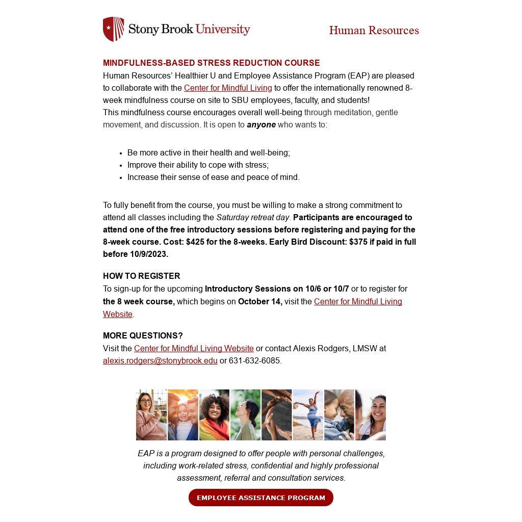 Human Resources’ Healthier U and Employee Assistance Program (EAP) are pleased to collaborate with the Center for Mindful Living to offer the internationally renowned 8-week mindfulness course on site to SBU employees, faculty, and students!