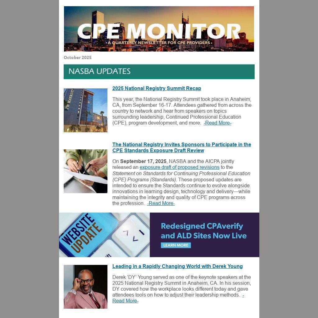 Click here to see the organizations that have been added to the National Registry of CPE Sponsors from July 1, 2025, through September 30, 2025.