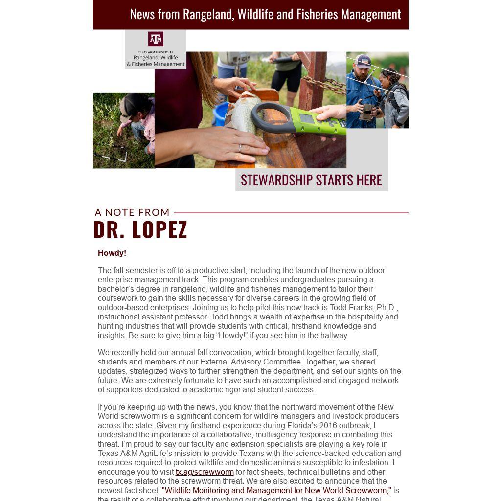 If you’re keeping up with the news, you know that the northward movement of the New World screwworm is a significant concern for wildlife managers and livestock producers across the state. Given my firsthand experience during Florida’s 2016 outbreak, I understand the importance of a collaborative, multiagency response in combating this threat. I’m proud to say our faculty and extension specialists are playing a key role in Texas A&M AgriLife’s mission to provide Texans with the science-backed education and resources required to protect wildlife and domestic animals susceptible to infestation. I encourage you to visit tx.ag/screwworm for fact sheets, technical bulletins and other resources related to the screwworm threat. We are also excited to announce that the newest fact sheet, "Wildlife Monitoring and Management for New World Screwworm," is the result of a collaborative effort involving our department, the Texas A&M Natural Resources Institute and the Texas Parks and Wildlife Department.