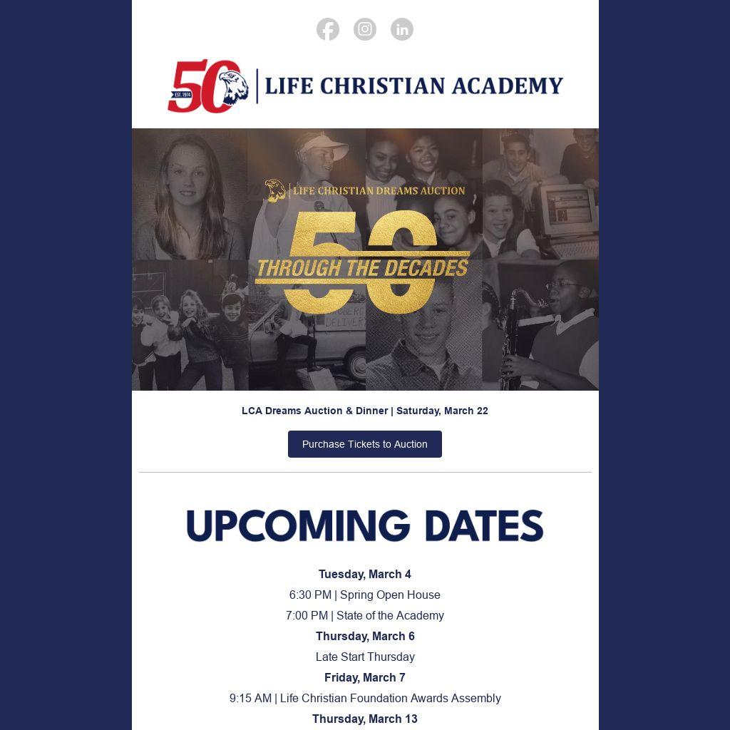 I am excited to invite you to the inaugural State of the Academy gathering, a new annual event designed to provide our families with a comprehensive update on the vision and direction of Life Christian Academy. Please join us on Tuesday, March 4, at 7:00 PM in the Life Center Auditorium for this important occasion.