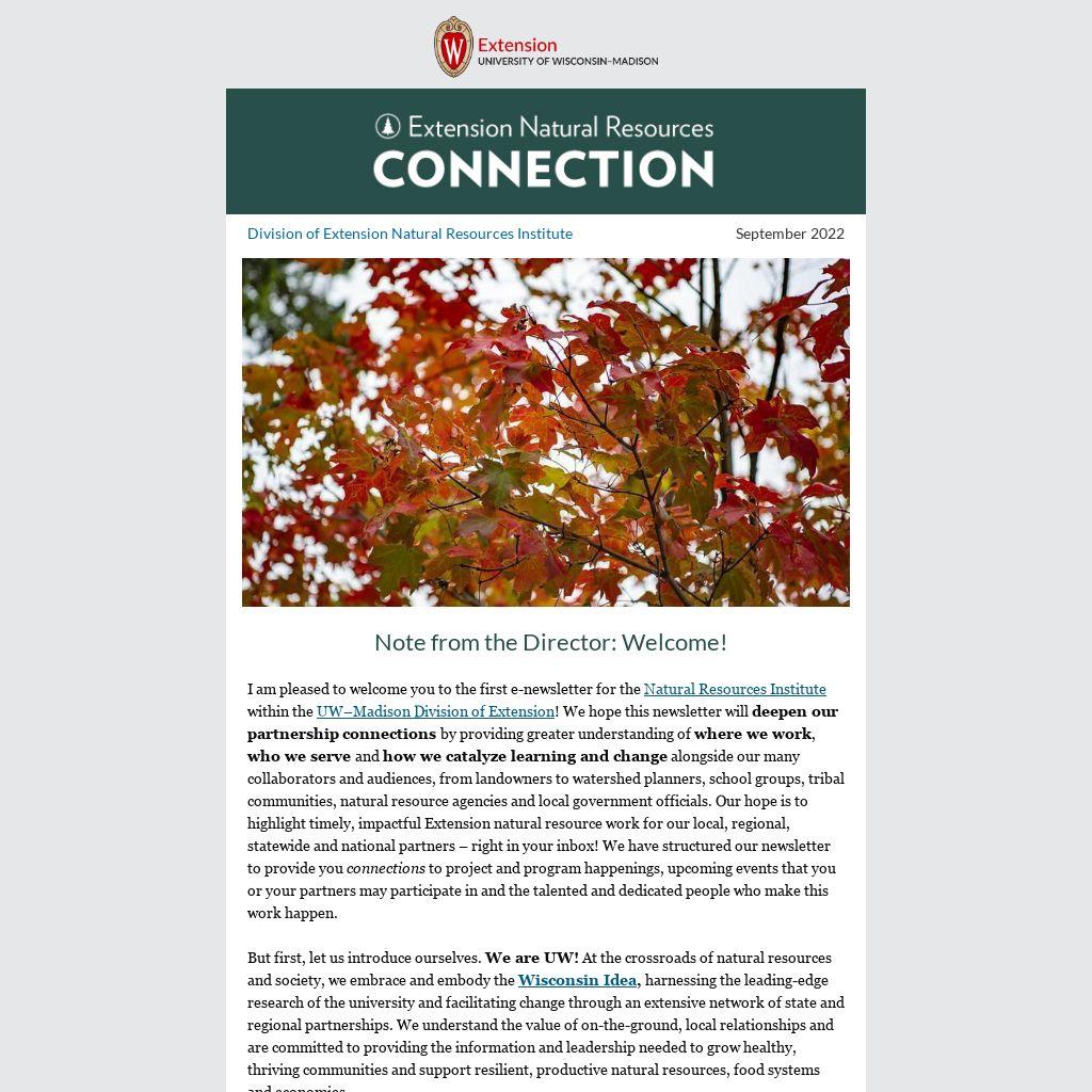 I am pleased to welcome you to the first e-newsletter for the Natural Resources Institute within the UW–Madison Division of Extension! We hope this newsletter will deepen our partnership connections by providing greater understanding of where we work, who we serve and how we catalyze learning and change alongside our many collaborators and audiences, from landowners to watershed planners, school groups, tribal communities, natural resource agencies and local government officials. Our hope is to highlight timely, impactful Extension natural resource work for our local, regional, statewide and national partners – right in your inbox! We have structured our newsletter to provide you connections to project and program happenings, upcoming events that you or your partners may participate in and the talented and dedicated people who make this work happen.