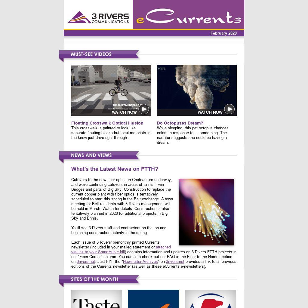 You'll see 3 Rivers staff and contractors on the job and beginning construction activity in the spring. Each issue of 3 Rivers' bi-monthly printed Currents newsletter (included in your mailed statement or attached via link to your SmartHub e-bill) contains information and updates on 3 Rivers FTTH projects in our "Fiber Corner" column. You can also check out our FAQ in the Fiber-to-the-Home section on 3rivers.net. Just FYI, the "Newsletter Archives" on 3rivers.net provides a link to all previous editions of the Currents newsletter (as well as these eCurrents e-newsletters). |