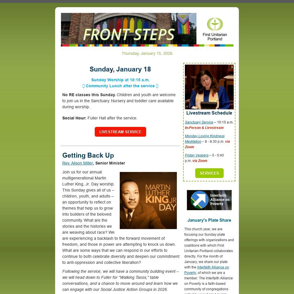 Everyone in our community is invited to worship on Sunday in honor of the Rev. Martin Luther King Jr. After our all ages service, please stay for a community lunch in Fuller Hall. Visitors welcome! Regular full RE program will resume on 1/25...MORE