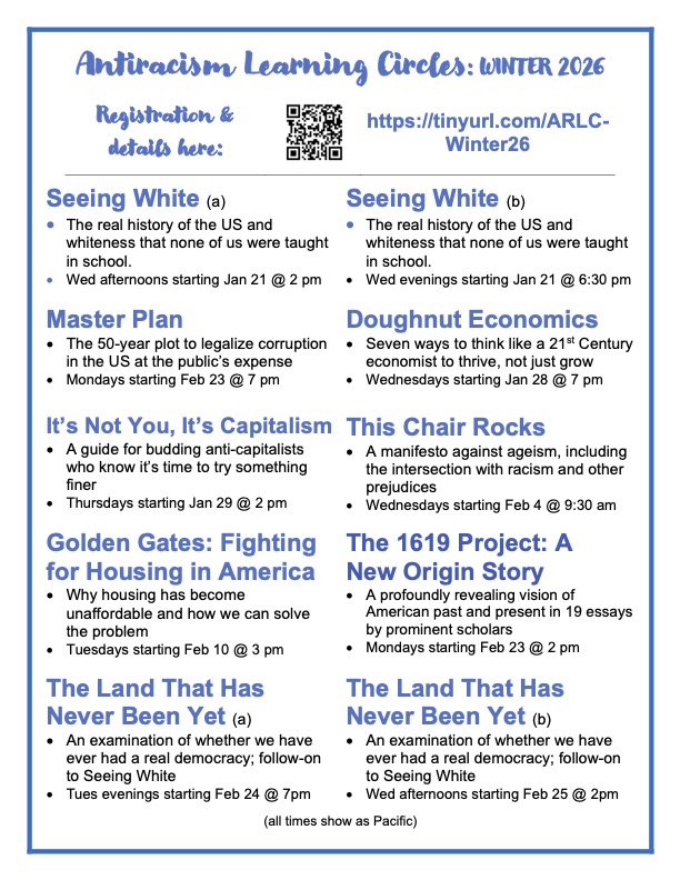 You are invited to join an Antiracism Learning Circle this winter. It’s on Zoom, so you can join from anywhere. Invite your friends, too. Circles start the week of January 19.