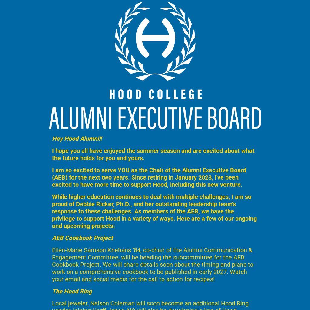 I am so excited to serve YOU as the Chair of the Alumni Executive Board (AEB) for the next two years. Since retiring in January 2023, I've been excited to have more time to support Hood, including this new venture.