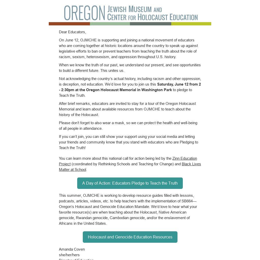 Not acknowledging the country’s actual history, including racism and other oppression, is deception, not education. We’d love for you to join us this Saturday, June 12 from 2 - 2:30pm at the Oregon Holocaust Memorial in Washington Park to pledge to Teach the Truth.