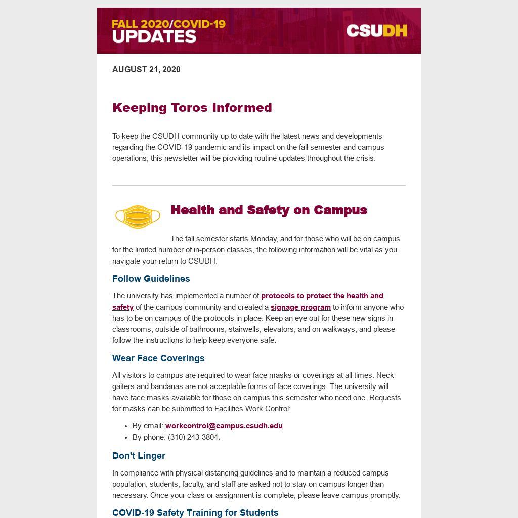 The fall semester starts Monday, and for those who will be on campus for the limited number of in-person classes, the following information will be vital as you navigate your return to CSUDH: