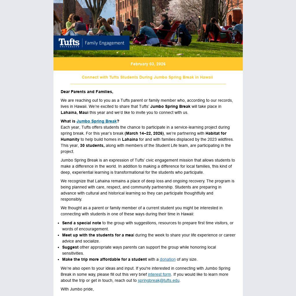 We are reaching out to you as a Tufts parent or family member who, according to our records, lives in Hawaii. We’re excited to share that Tufts’ Jumbo Spring Break will take place in Lahaina, Maui this year and we’d like to invite you to connect with us.