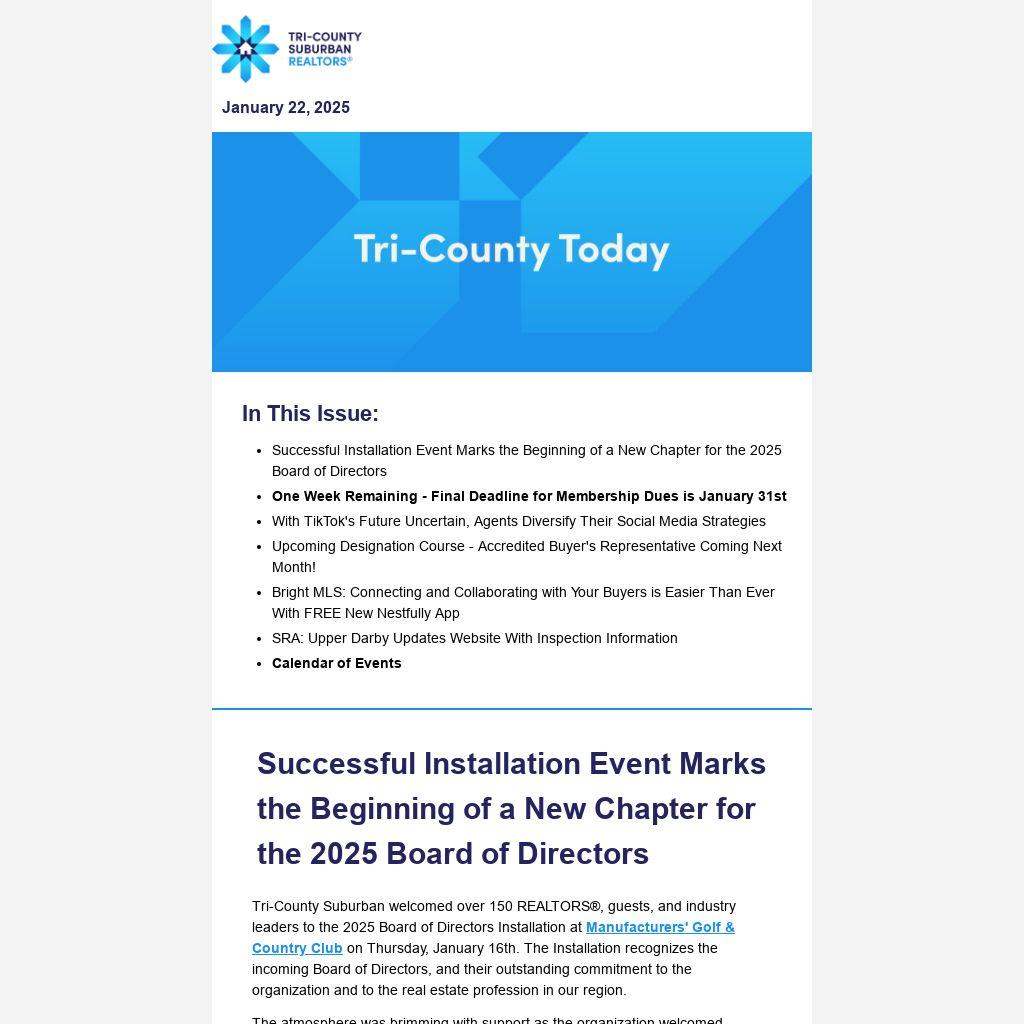 Tri-County Suburban welcomed over 150 REALTORS®, guests, and industry leaders to the 2025 Board of Directors Installation at Manufacturers' Golf & Country Club on Thursday, January 16th. The Installation recognizes the incoming Board of Directors, and their outstanding commitment to the organization and to the real estate profession in our region.